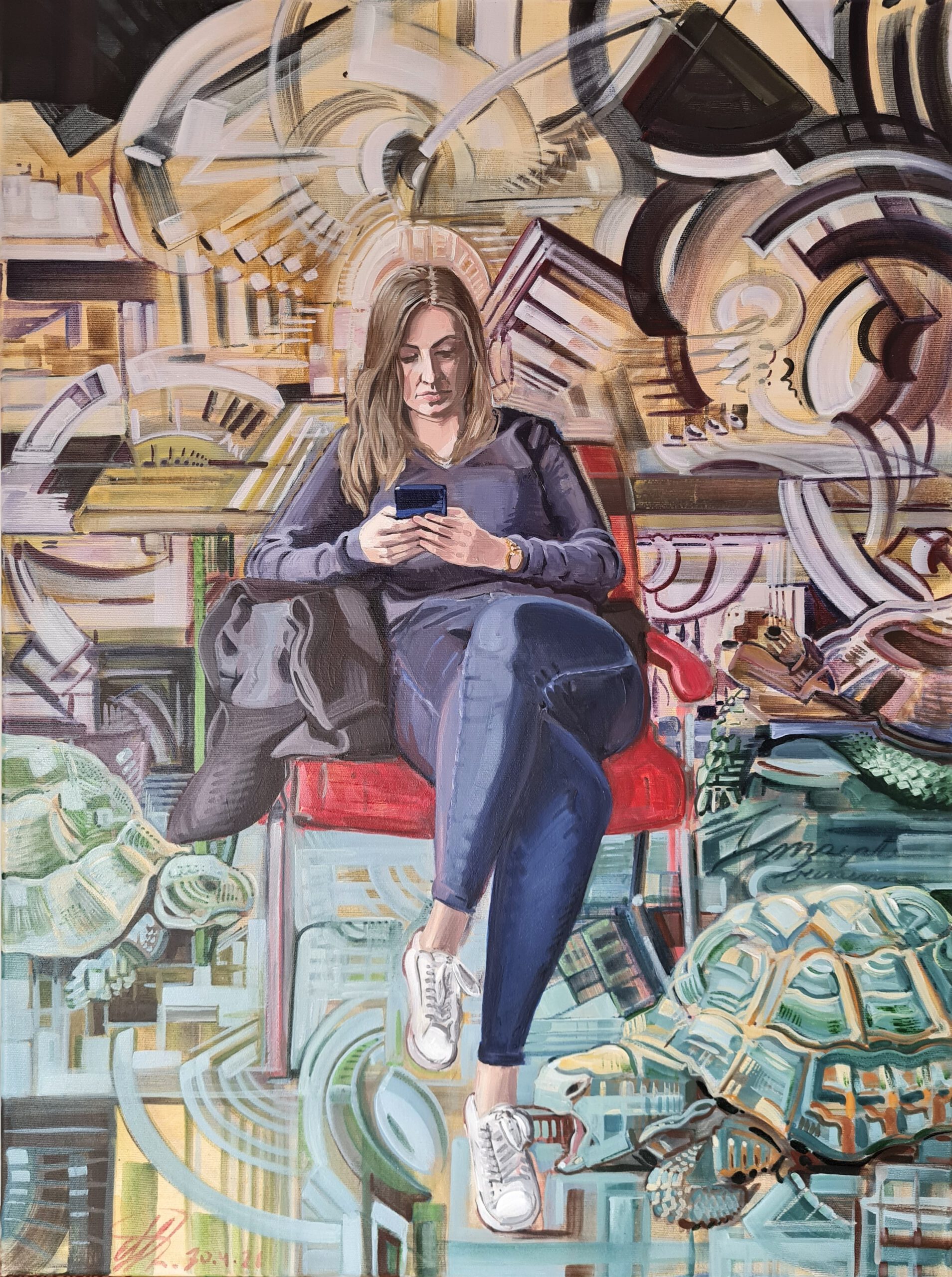 Ici, j’ unie des natures mortes à mes pensées et sentiments. Au milieu de différentes techniques de peinture, j’insère des motifs réels tels que les tulipes. Ces images montrent clairement que la réalité est subjective et que chacun la perçoit différemment.